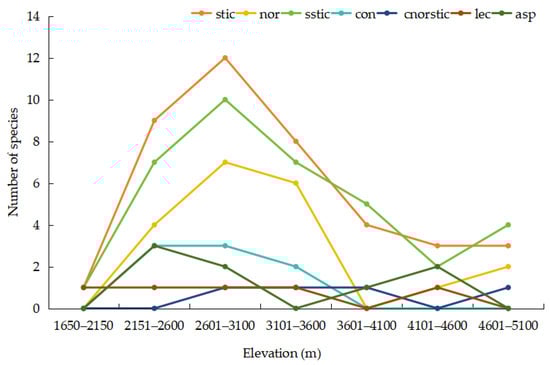 The Xinjiang Uygur Autonomous Region, also known as Xinjiang, China, is notable for its high diversity and abundance of lichens. The purpose of this study was to examine species diversity and the distribution patterns of saxicolous lichens, family Megasporaceae, which includes the genera Aspicilia, Circinaria and Lobothallia, in Xinjiang Province. Morphology, anatomy, chemical analysis and rDNA-ITS sequences for the species were employed for their identification. As a result, 34 crustose and strictly saxicolous species belonging to three genera were found, which included 22 species of the genus Aspicilia, two of which were new to Xinjiang (A. disjecta (Zahlbr.) J.C. Wei and A. pycnocarpa Q. Ren & Lin Liu), eight common species of Circinaria, as well as four species of Lobothallia, two of which (L. determinata (H. Magn.) T.B. Wheeler and L. pruinosa Kou & Q. Ren) are new provincial records. There was a unimodal pattern with respect to lichen species richness; all specimens of the Megasporaceae family were found between 1600 and 5100 m altitude. The 30 species were collected at altitudes between 2601 and 3100 m; only four species were recorded below 2150 m, and seven were found above 4600 m. As far as the type of rocks are concerned, 24 species were found on siliceous rocks and 10 species were found on calcareous rocks. The 24 lichen species contained seven different secondary metabolites; stictic acid, substictic acid and norstictic acid were more common, whereas aspicilin, constictic acid, lecanoric acid and connorstictic acid were found in only a few lichen species.