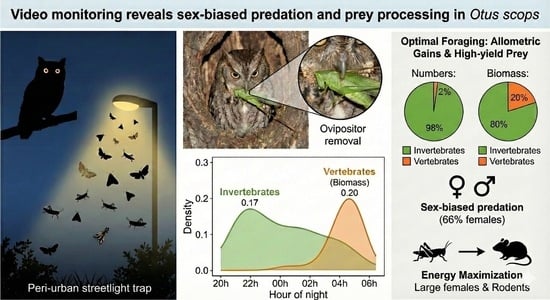 This study analyzes the provisioning strategy of the European Scops Owl (Otus scops) via continuous video monitoring of a breeding pair in a peri-urban Mediterranean forest in NE Spain (n = 724 deliveries). Invertebrates dominated numerically, with Orthoptera constituting 64.6%. Although vertebrates were scarce (1.8%), they contributed disproportionately to total biomass (20.8%), with rodents alone accounting for 20.3% of delivered energy. Parental effort followed a bimodal nocturnal rhythm, peaking at darkness onset (22:00 h) and before dawn. Crucially, we found a significant predation bias towards female orthopterans (65.6% vs. 34.3%; p < 0.001). While driven by Meconema thalassinum, selection in larger species like Tettigonia viridissima evidences a strategy focused on biomass profitability. Since Ensifera biomass scales allometrically (W ), selecting females yields disproportionate energetic gains. We also report the systematic removal of ovipositors prior to delivery, a behavior that optimizes intake but renders high-value females undetectable in traditional pellet analyses. These results suggest O. scops exploits artificial light sources (“streetlight traps”) to maximize foraging efficiency.