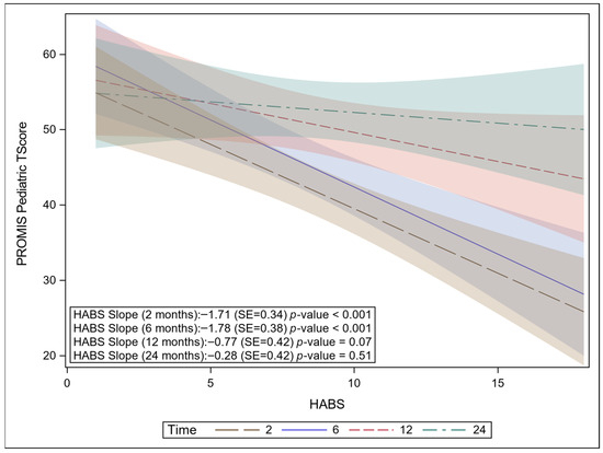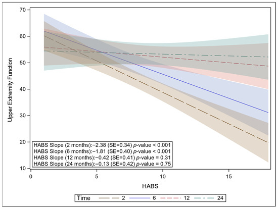 Background: Hand burns are common in children and can result in long-term functional impairment. The Hand Burn Severity (HABS) score is an anatomy-specific measure of hand burn severity, but its relationship to functional outcomes in pediatric patients has not been well defined. The purpose of this study was to determine whether HABS, measured at the time of injury, is associated with longitudinal upper extremity functional outcomes in children. Methods: We conducted a 24-month prospective longitudinal study of children aged 2–18 years with hand burns. Burn severity was determined using HABS at enrollment, and outcomes were measured using the Burn Outcomes Questionnaire (BOQ) and the eight-item Patient-Reported Outcomes Measurement Information System-Upper Extremity (PROMIS-UE8). Repeated-measures linear regression models evaluated associations between HABS and outcomes over time, adjusting for age, dominant- and bilateral-hand involvement, and surgery. Results: A total of 119 children with 165 hand burns were enrolled. Higher HABS scores, indicating more severe injury, were significantly associated with lower BOQ upper extremity function domain scores, indicating poorer health, at 2- and 6-months post burn, but not at later time points. Higher HABS scores were independently associated with lower patient-reported PROMIS-UE8 scores, indicating poorer health, across the 2-year follow-up period. Conclusions: These findings indicate that higher HABS scores at the time of injury are associated with poorer upper extremity outcomes, particularly in the early post-burn period, suggesting that HABS may help identify children who could benefit from closer monitoring or early rehabilitation planning.