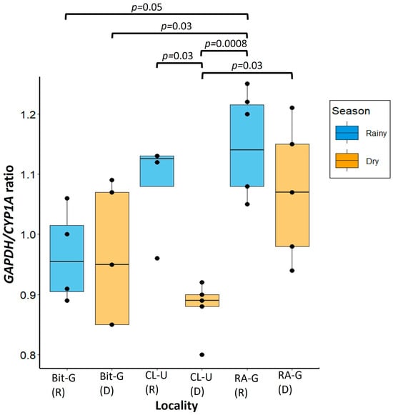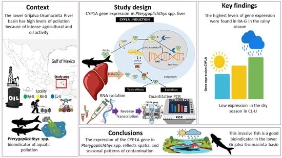 Aquatic ecosystems are currently facing anthropogenic pollution, mainly derived from agricultural, industrial, and urban runoff, including heavy metals, polycyclic aromatic hydrocarbons (PHAs), pesticides, fertilizers, and untreated wastewater discharges. To understand the impact of environmental contamination on fish, this research compared cytochrome P450 1A (CYP1A) gene expression in armored catfish across three locations in the lower Grijalva–Usumacinta River basin known for varying levels of pollution. Samples from the Ribera Alta, the Bitzales River, and the Chaschoc lagoon were collected during the dry and rainy seasons. We isolated RNA from liver samples, which were subsequently converted to cDNA. We used quantitative PCR to analyze CYP1A gene expression. Results showed that, of the three locations, Ribera Alta demonstrated the highest expression during the rainy season. Only in Chaschoc Lagoon did we observe significant differences between seasons (p = 0.03). This indicates that seasonal factors and the presence of pollutants in the water bodies and sediments likely play a role in regulating CYP1A gene expression in this fish species.