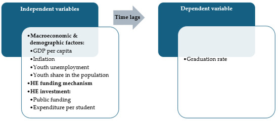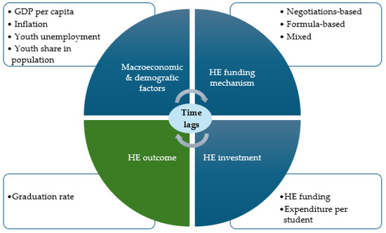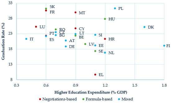 Higher education (HE) funding mechanisms in the European Union (EU) are undergoing substantial reform, with universities facing increasing pressure to improve performance outcomes under constrained public budgets. This study analyses how the design of HE funding mechanisms—specifically, the logic of resource allocation and the principles of performance evaluation, together with the volume of public investment, macroeconomic conditions, and demographic factors—affect graduation rates in the EU. The study uses panel data from 27 EU Member States for the period 2013–2023 and applies multiple regression models with one- to four-year lags to assess the delayed effects of funding and economic factors. The results showed that a larger share of young people in the population and public expenditure per student are positively and statistically significantly associated with higher graduation rates (p < 0.01). Meanwhile, the overall level of funding (HE expenditure as a share of GDP) and performance-based funding (PBF) mechanisms are associated with lower graduation rates (p < 0.01). GDP per capita has a negative effect (p < 0.01), indicating that stronger labour market opportunities may reduce the motivation to complete studies. Youth unemployment and inflation proved to be statistically insignificant (p > 0.05). The most substantial effect was found after two years, confirming the delayed but weakening impact of funding and macroeconomic factors on study graduation rates. The study extends previous work by integrating an analysis of funding design and time dimensions at the EU level. The results emphasise that it is not so much the amount of funding that is important for higher education outcomes, but instead how it is funded—therefore, targeted, student-oriented investments and long-term policy consistency are necessary to achieve higher graduation rates.