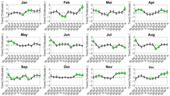 The monthly variability of Upper Tropospheric Humidity with respect to ice (UTHi) is examined during the forty-year period 1979–2020. Trends per decade are calculated for every month separately and for 10° latitude bands. Statistical significance is estimated with the Mann–Kendall test. Results show