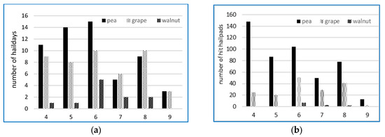 The objective of this study is the statistical analysis of a six-year period (2019–2024) hit hailpad dataset over the area of Central Macedonia to define the temporal and spatial distributions of selected hail parameters based on hailpad network data. The maximum number of hail days was recorded in June, while the maximum number of hit hailpads was recorded in April and the secondary maximum was registered in June. During the spring months, hailfalls contain hail small in size, while during the summer months, larger sizes of hail are recorded more frequently. The region most frequently affected by hail is the northwest-west part of the area, and locally, the southern part. Pea- and grape-size hail is distributed almost evenly over the whole protection area, but walnut-size hail is mainly recorded over a rather narrow strip that crosses the entire area from northwest to southeast in its central part.