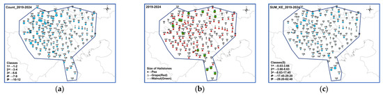 The objective of this study is the statistical analysis of a six-year period (2019–2024) hit hailpad dataset over the area of Central Macedonia to define the temporal and spatial distributions of selected hail parameters based on hailpad network data. The maximum number of