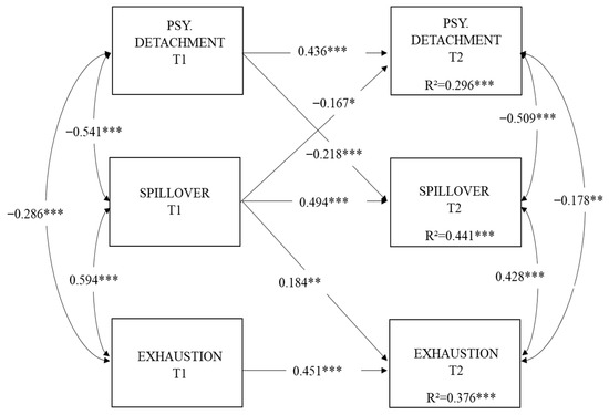 Background: Healthcare professionals are highly exposed to work-related stressors, which increases their vulnerability to exhaustion, a key dimension of burnout. Psychological detachment, defined as the ability to mentally disengage from work during off-job time, has been identified as a key recovery mechanism. However, the processes linking detachment to exhaustion over time remain underexplored. Methods: This study integrated the Conservation of Resources theory and the Stressor–Recovery Model to test a two-wave longitudinal model, in which negative work–home spillover mediates the relationship between psychological detachment and exhaustion. The reverse pathways were also examined. Data were collected from 258 healthcare professionals at an Italian hospital, who completed self-report questionnaires at two time points over a two-year period. Structural equation modeling was employed to test the hypothesized relationships. Results: Psychological detachment at Time 1 predicted lower spillover at Time 2, which in turn was associated with lower exhaustion, supporting a full mediation model. Additionally, spillover at Time 1 negatively predicted detachment at Time 2, suggesting the existence of a potential loss cycle, while reverse effects from exhaustion to spillover or detachment were not supported. Conclusions: These findings highlight the crucial role of psychological detachment in preventing long-term exhaustion among healthcare professionals by reducing work–home spillover, providing valuable insights for interventions that promote recovery processes.