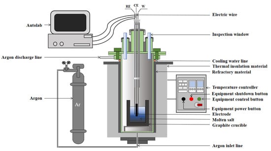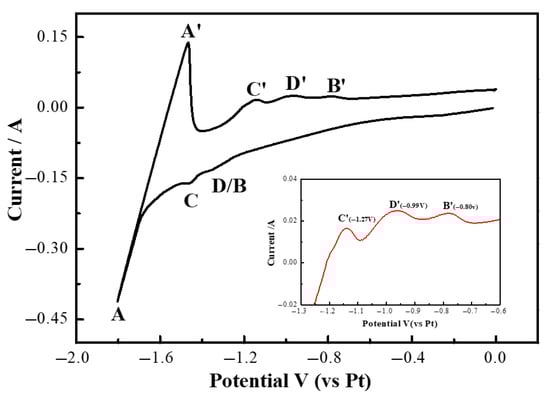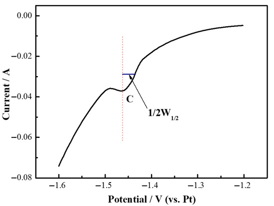 Yttrium–magnesium alloys are commonly employed as processing additives in magnesium alloy materials. Incorporating yttrium into magnesium alloys via Y-Mg intermediate alloys not only minimizes oxidation and burn-off loss but also simplifies operational procedures. Utilizing yttrium–magnesium alloys ensures a stable composition and reliable quality of magnesium alloy products, while contributing to reduced production costs and minimized environmental pollution. In this study, a molten salt co-reduction method was developed for the preparation Y-Mg intermediate alloys. The electrochemical co-reduction behaviors of Y(III) and Mg(II), as well as the transient states of Y-Mg intermediate alloys, were systematically investigated by transient electrochemical techniques. Results indicated that the reduction of Y(III) at the molybdenum (Mo) cathode is a reversible electrochemical process, whereas the reduction of Mg(II) is irreversible and diffusion-controlled. The diffusion coefficient of Y(III) and Mg(II) in the fluoride salt at 1000 °C were determined to be 3.98 × 10−5 cm2/s and 1.16 × 10−3 cm2/s, respectively. Electrochemical calculations revealed that the reduction of Y(III) involves a single-step transfer of three electrons, while Mg(II) involves a single-step transfer of two electrons. The corresponding electrode reactions are Y(III) + 3e−→Y and Mg(II) + 2e−→Mg, respectively. A Y-Mg alloy sample prepared by constant-current molten salt electrolysis primarily consists of the MgY phase with a composition of 88.38 wt% yttrium and 11.62 wt% magnesium.