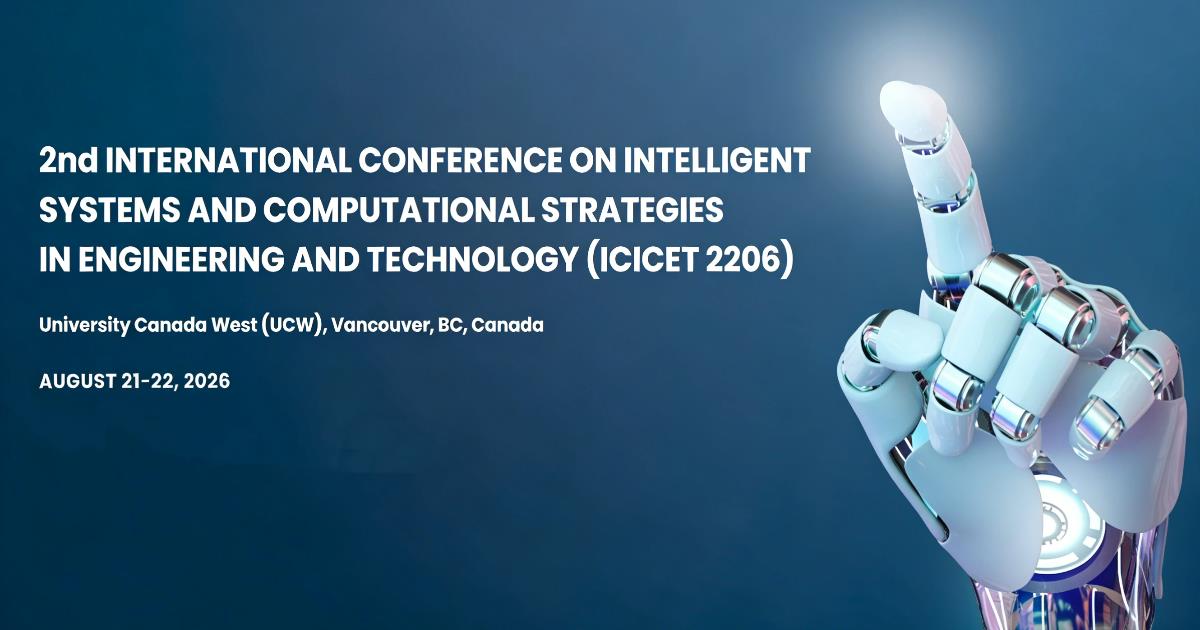 2nd International Conference on Intelligent Systems and Computational Strategies in Engineering and Technology (ICICET 2026) is scheduled to take place on August 21–22, 2026, University Canada West (UCW), Vancouver, BC, Canada. ICICET 2026 aims to provide a platform for experts to exchange knowledge, present groundbreaking research, and explore emerging trends in intelligent systems, computational strategies, and engineering technologies. We invite you to submit your original research contributions and be part of this dynamic gathering of scholars and professionals discussing the future of intelligent and computational technologies. Accepted and presented papers will be published in Scopus-indexed proceedings, ensuring global visibility and impact. Join us in Vancouver, a city known for its stunning landscapes, technological advancements, and vibrant scientific community. We look forward to welcoming you to ICICET 2026.