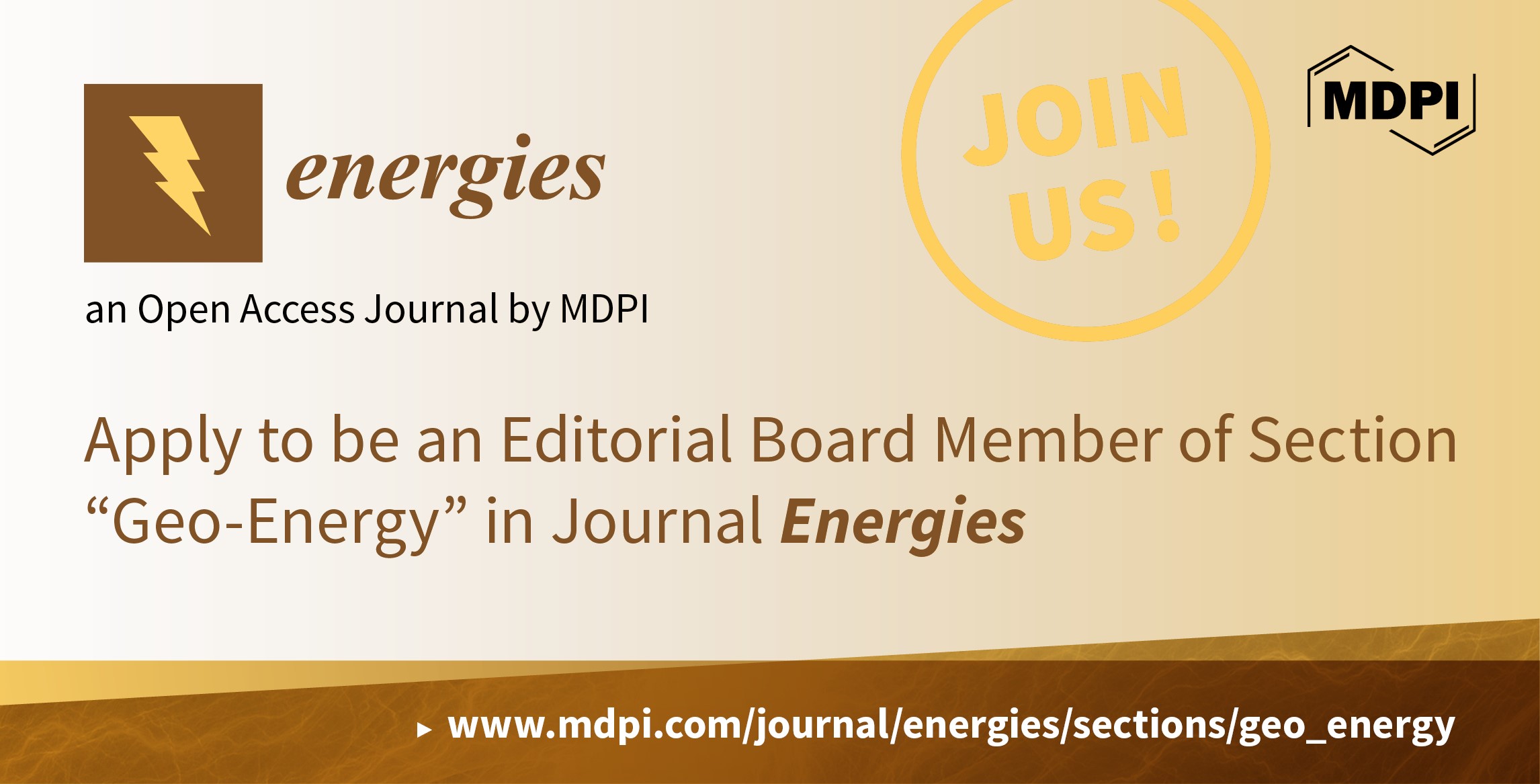 We are now recruiting Editorial Board Members (EBMs) for the Section “Geo-Energy” (https://www.mdpi.com/journal/energies/sections/geo_energy) of Energies (ISSN: 1996-1073). If you are an active researcher in the field and are passionate about publishing cutting-edge research, please do not hesitate to contact Section Managing Editor Ms. Gillian Yang (email: gillian.yang@mdpi.com).