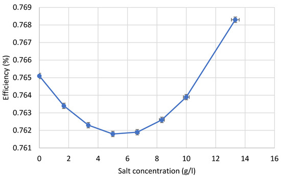 Thermal energy storage (TES) plays a crucial role in improving the efficiency and reliability of solar thermal systems, particularly when low-cost and readily available materials are desired. This study experimentally investigates the performance of a water–salt thermal energy storage system using sodium chloride (NaCl) at different concentrations in a simple solar collector setup. Experiments were conducted using a laboratory-scale solar thermal energy system under controlled conditions, with water serving as the heat transfer fluid and a fixed flow rate of 15 L/h. The storage medium consisted of water mixed with salt, which was obtained from the Dead Sea before any treatment. In its raw form, this type of salt contains impurities, mainly sand, at a fixed concentration of approximately 1% by weight. The effects of salt concentration on storage temperature, system efficiency, and effective heat capacity were analyzed. The results show that moderate NaCl concentrations improved the average storage temperature by up to 12–18%, increased thermal storage efficiency by approximately 1%, and enhanced the effective specific heat capacity compared to pure water. In contrast, higher salt concentrations resulted in a performance reduction of up to 8–12% due to increased thermal resistance and reduced heat transfer effectiveness. An optimal salt concentration range was identified at which maximum storage efficiency and heat capacity were achieved. These findings demonstrate that common sodium chloride can serve as an effective and economical enhancement material for thermal energy storage when properly optimized. The study provides quantitative evidence and practical insights for the development of low-cost, salt-based thermal energy storage systems for solar thermal applications. This study highlights the importance of concentration optimization and provides practical insights for the development of low-cost, salt-based thermal storage systems for solar energy applications.