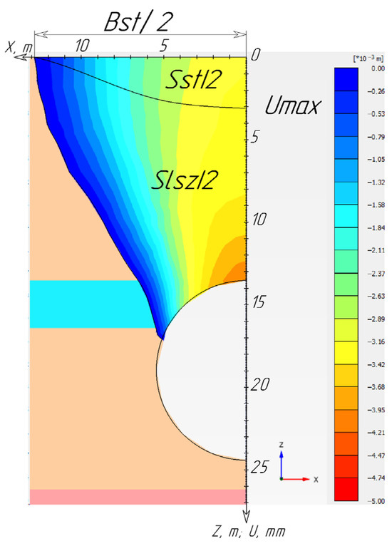This paper presents the development and results of an analytical method for calculating the stability coefficient of a rock mass that is capable of adjusting the face support pressure required for face stability depending on changes in the mass structure at the tunnel face. The analytical relationships presented in this work are based on the simulation of 225 three-dimensional finite element numerical models. The influence of the mass structure at the tunnel face was examined by varying the thickness and position of the layer at the tunnel face, as well as its stiffness and strength parameters. The maximum difference in the values of the main monitored criteria exceeded 85% for such indicators as the area of the surface settlement trough, the area of the zone of negative vertical deformations, the width of the settlement trough, and the maximum value of vertical settlements. This study proposes a practical implementation of the developed analytical method—a stability coefficient of the soil mass was developed to adjust existing analytical relationships when a soil layer with mechanical characteristics differing from the host mass is present at the tunnel face.