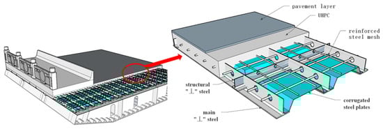 Through static bending tests on two full-scale specimens of a new steel grating–UHPC (ultra-high-performance concrete) composite bridge deck, the load–displacement curves, crack propagation, strain distribution, and failure characteristics were analyzed. According to the experimental results, a numerical model was established using ABAQUS software 2021, in which two contact methods were employed to simulate the interfacial connection between UHPC and steel. The results indicate that the surface-to-surface contact method provides better agreement with the experimental data. Subsequently, conducted parameter studies using this model to investigate the impact of key geometric parameters, including section height, flange width, flange thickness, steel bottom plate thickness, and steel web plate thickness, on the flexural performance of the structure. The results demonstrated that the section height and the steel bottom plate thickness had a significant effect on the load-bearing capacity and overall stiffness of the component, while the influence of other parameters was comparatively minor. Finally, based on both experimental and numerical results, a formula for calculating the flexural bearing capacity of steel grating–UHPC composite bridge slabs was proposed, providing a reference for the structural design and promotion of the new composite bridge deck.