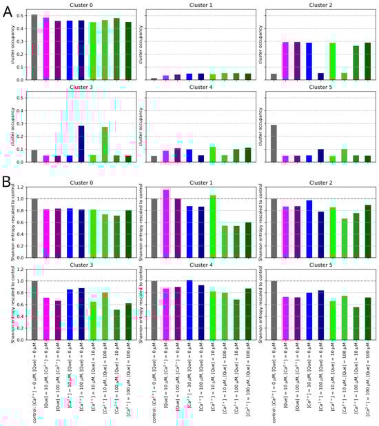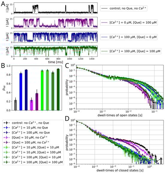 Understanding the functional modulation of ion channels by multiple activating substances is critical to grasping stimulus-specific gating mechanisms and possible synergistic or competitive interactions. This study investigates the activation of large-conductance, voltage- and Ca2+-activated potassium channels (BK) in the plasma membrane of human bronchial epithelial cells by Ca2+ and quercetin (Que), both individually and in combination. Patch-clamp recordings were analyzed using open state probability, dwell-time distributions, Shannon entropy, sample entropy, power spectral density (PSD), and empirical mode decomposition (EMD). Our results reveal concentration-dependent alterations in gating kinetics, particularly at a low concentration of quercetin ([Que] = 10 μM) compared with [Que] = 100 μM, where some Que-related effects are strongly attenuated in the presence of Ca2+. We also identify specific frequency bands where oscillatory components are most sensitive to the considered stimuli. Our findings highlight the complex reciprocal interplay between Ca2+ and Que in modulating BK channel function, and demonstrate the interpretative power of entropic and signal-decomposition approaches in characterizing stimulus-specific gating dynamics.