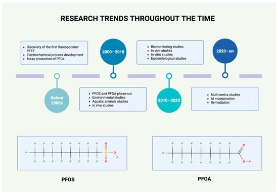 Per- and polyfluoroalkyl substances (PFAS) are a large family of synthetic chemicals known for their exceptional stability, strong surface activity, and ability to repel both water and oil. Due to these characteristics, PFAS have been widely used since the 1950s across multiple industries. However, over the decades, these substances have emerged as persistent and bioaccumulative contaminants. While it is evident that PFAS pose adverse effects on both ecosystems and human well-being, the mechanisms underlying their toxicities are yet to be fully understood. To better examine the thematic evolution of PFAS research, this review divides the literature into four distinct eras: before 2000s, from 2000 to 2010, from 2010 to 2020, and from 2020 onwards. Since the latter half of the 20th century, the rapid development and mass production of PFAS resulted in the manufacture of thousands of industrial and household products. After decades of concerns regarding their toxic impacts, major phase-outs in the early 2000s shifted attention towards environmental studies and biomonitoring. Throughout the 2010s, extensive studies were conducted to assess the PFAS toxicities, especially perfluorooctane sulfonate (PFOS) and perfluorooctanoic acid (PFOA), the two widely detected compounds on human populations. Since 2020, research efforts have increasingly progressed toward molecular-level studies, advancements in analytical detection methods, and remediation technologies. Additionally, this review examines regulatory changes, highlights current knowledge gaps, and outlines directions for future research.