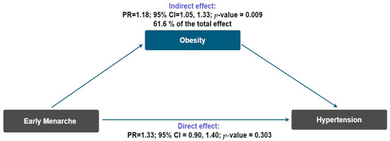 Background/Objectives: Cardiovascular diseases are the leading cause of mortality worldwide and are strongly influenced by obesity and hypertension. Age at menarche has been proposed as an early marker of cardiometabolic risk, but evidence in postmenopausal women is inconsistent, particularly in Mexico. We aimed to evaluate the association between early menarche and obesity and hypertension in postmenopausal women, and to examine whether obesity mediates this relationship. Methods: We conducted a cross-sectional study based on a retrospective review of 462 medical records of postmenopausal women who attended a tertiary hospital in Mexico City between January 2023 and August 2024. Early menarche was defined as <12 years. Obesity and hypertension were identified from records. Associations were estimated using Poisson regression with robust variance to obtain prevalence ratios (PRs) and 95% confidence intervals (CIs). We assessed effect modification by age at menopause and conducted a mediation analysis under the counterfactual framework to estimate the proportion of the menarche–hypertension association explained by obesity. Results: Early menarche was associated with a higher prevalence of obesity (PR = 1.36, 95% CI = 1.08–1.70) and hypertension (PR = 1.34, 95% CI = 1.06–1.71). Associations were stronger among women with menopause at ≤45 years. Mediation analysis indicated that obesity explained 61.6% of this relationship, with a significant indirect effect (PR = 1.18, 95% CI = 1.05–1.33). Conclusions: Early menarche was independently associated with obesity and hypertension in postmenopausal women, with obesity acting as a potential intermediary factor. Given the cross-sectional design, causality cannot be established, but the associations observed are biologically and temporally coherent.