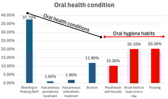 Objectives: This cross-sectional observational and epidemiological study aimed to collect data on the oral health conditions of the prison population in Rio de Janeiro, Brazil. Methods: The Penitentiary Moniz Sodré, part of the Penitentiary Complex of Bangu, houses 1385 male inmates of different nationalities. They were divided into groups according to age: Group 1, prisoners aged 18 to 27 years; Group 2, from 28 to 37 years; Group 3, from 38 to 47 years; and Group 4, from 48 and older. A survey was performed, and the Decayed, Missing, Filled Teeth (DMFT) index was applied. A statistical analysis was conducted, considering a p-value of less than 0.05 as significant. Then, multiple linear regression was implemented to verify correlations among the studied parameters, to adjust for confounders, and to examine predictors of DMFT scores. Results: The average age was 26.95 ± 6.72 years, with 57.7% smokers (n = 720) and 7.7% (n = 96) former smokers. Lung diseases were also relatively common (20.9%). The most frequently reported oral issue was bleeding on probing (37.7%, n = 470), with 100% presenting visible dental plaque and 71.3% dental calculus. Oral hygiene habits showed moderate adherence, with 20.1% brushing their teeth at least once daily and 20.3% flossing; however, only 10.3% reported using fluoride mouthwash. The average DMFT score progressively increased across age groups: Group 1 (age: 18–27): 6.89; Group 2 (age: 28–37): 10.87; Group 3 (age: 38–47): 16; and Group 4 (age ≥ 48): 22.5 (p < 0.0001). Decayed (D) teeth scores showed a moderate increase: Group 1: 2.94 ± 2.74; Group 2: 3.38 ± 2.65; Group 3: 3.11 ± 2.56; Group 4: 3.75 ± 3.1 (p = 0.0029). Missing (M) teeth scores demonstrated a significant increase with age, from 2.74 (±2.84) in group 1 to 18.12 (±7.71) in group 4 (p < 0.0001), whereas Filled (F) teeth scores were highest in group 3 (mean 1.92 ± 4.13), followed by a decline in the oldest group (mean 0.62 ± 1.18) (p < 0.0001). These findings indicate a strong age-related increase in the total DMFT score, primarily driven by the number of missing teeth. Conclusions: High levels of caries and its sequelae exist, demonstrating a correlation with age, as well as a low level of previous periodontal treatment or intervention. As the treatments performed did not manage to reduce the incidence of caries and periodontal diseases, a high number of extractions were observed in patients in confinement.