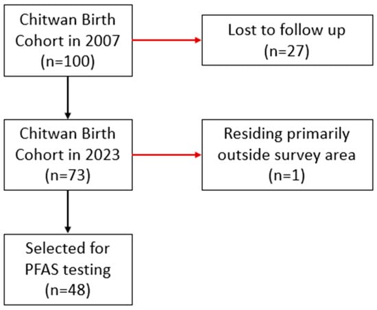 Background/Objectives: Per- and polyfluoroalkyl substances (PFAS) are globally widespread contaminants linked to adverse health outcomes, including immune dysregulation. We aimed to characterize PFAS exposure among adolescents in Nepal. We conducted a cross-sectional study in Chitwan District, Nepal, during September–October 2023, enrolling 73 adolescents