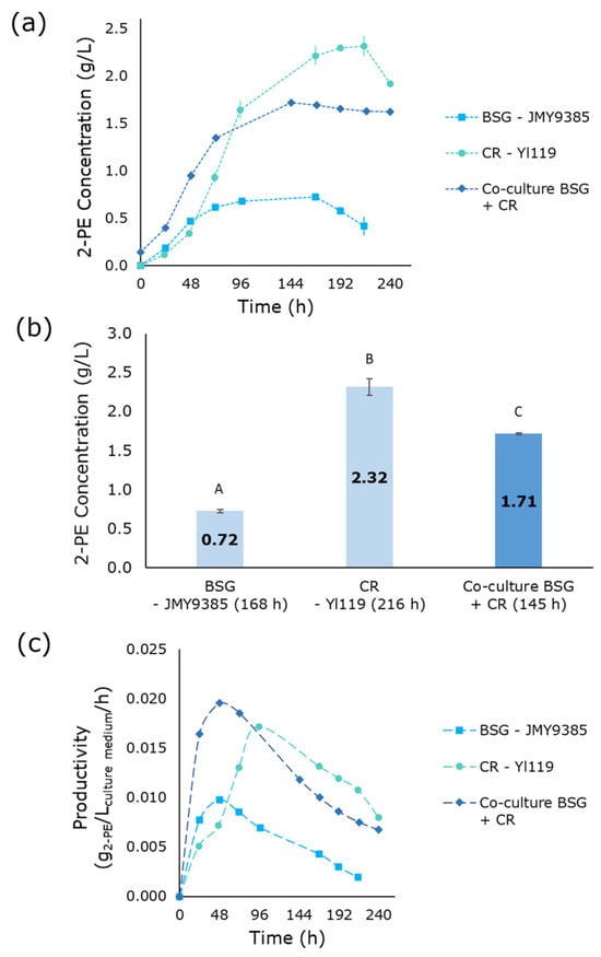 The bioproduction of 2-phenylethanol (2-PE), a high-value aromatic compound widely used in the fragrance, cosmetic, food and beverage, and pharmaceutical industries, through yeast fermentation offers a sustainable alternative to chemical synthesis and rose extraction. This study explores the fermentation of Yarrowia lipolytica strains using mixed agro-industrial by-products as substrates to produce 2-PE via de novo synthesis, without supplementation with the costly precursor L-phenylalanine. Y. lipolytica strains were genetically engineered to enhance flux through the shikimate pathway and enable the hydrolysis of a broader range of substrates. The culture media consisted solely of a mixture of agro-industrial by-products: sugar beet molasses (SBM), brewer’s spent grain (BSG) pressing extract, and chicory root (CR) pressing extract, serving as the primary carbon and nitrogen sources without the addition of nutrients, minerals, synthetic, complex ingredients, or costly additives. The co-culture approach enhanced substrate utilization, leading to an increase in 2-PE titers, reaching approximately 2.5 g/L 2-PE production after 240 h of fermentation. This study demonstrates the feasibility of integrating co-culture fermentation and agro-industrial waste valorization for sustainable 2-PE production, offering a scalable bioprocess for industrial applications.