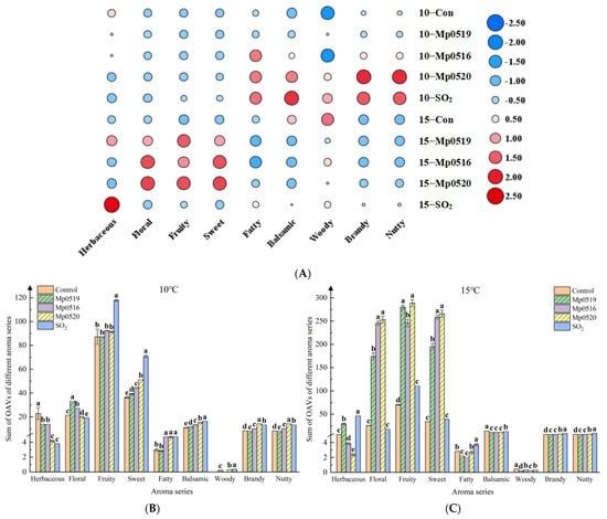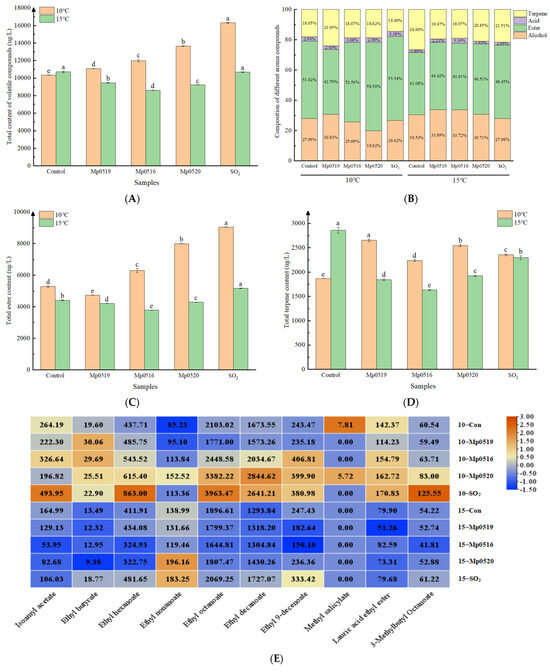 In response to increasing safety concerns regarding the use of sulfur dioxide (SO2) in winemaking, this study investigates the efficacy of Metschnikowia pulcherrima-mediated cold maceration (Mp-CM) as a potential alternative to SO2 at industrial temperatures (10–15 °C). The analysis focused on the content of different phenolics, as well as wine color properties and aroma compounds. These parameters were compared against those obtained from CM with SO2 (SO2-CM). This study introduces and compares the phenolics, wine color properties, and volatile compounds produced by three Metschnikowia pulcherrima strains (Mp0519, Mp0516, and Mp0520 were previously isolated from Muscat Hamburg grapes in the Jieshi mountain region), revealing that the effectiveness of the treatments varied depending on the temperature and strain. At 10 °C, Mp-CM showed significantly lower phenolic (−19.23%) and flavonoid (−41.13%) content compared to SO2-CM but exhibited markedly higher anthocyanin and terpene content (+133.11% and +12.61%, respectively), with similar tannin levels. Conversely, at 15 °C, Mp-CM outperformed SO2-CM in several key metrics, including total phenolics (+17.32%), flavonoids (+83.45%), tannins (+17.05%), and anthocyanins (+54.08%), and demonstrated a significantly enhanced floral/fruity aroma intensity (+160.72%). Furthermore, Mp0520 exhibited peak levels of phenolics and esters at 10 °C, while Mp0519 reached its highest terpene level at 10 °C and total volatile at 15 °C. Notably, Mp-CM consistently displayed specific characteristics regardless of the maceration temperature, including a reduction in total volatile compounds, a suppression of ester formation, an enhancement of anthocyanin content, and an improvement of the wine’s floral aroma, with strain-specific variations observed across all evaluated parameters. This study illustrates that the Mp-CM provides distinct advantages in extracting key components from grape skins, and it has the potential to enhance wine color attributes. This positions Mp as a promising SO2 alternative for CM, contingent on strain selection and process optimization.