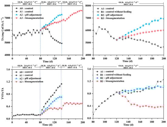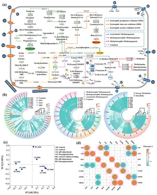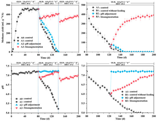 High organic loading is known to destabilize anaerobic digestion (AD). This study compared bioaugmentation and pH adjustment under increasing organic loading rate (OLR: 2.0, 4.0 and 6.0 gVS L−1 d−1), focusing on the responses of microbial structure, metabolic pathways, and energy metabolism. Results demonstrated that bioaugmentation maintained stable methane production of 400.54 ± 10.08 and 374.15 ± 24.32 mL·g-VS−1 at 4.0 and 6.0 gVS L−1 d−1, respectively, whereas control and pH-adjusted reactors failed at 4.0 gVS L−1 d−1. The acidified system restored methane yield from 86.30 to 382.13 mL·g-VS−1 after bioaugmentation, whereas pH adjustment and feeding cessation were ineffective, failing to produce methane within 25 days. Microbial analysis showed bioaugmentation enriched Methanosarcina, enhanced hydrogenotrophic/methylotrophic methanogenesis, and strengthened syntrophy with syntrophic propionate-oxidizing bacteria (SPOB), reducing volatile fatty acid accumulation via reinforced syntrophic propionate/butyrate oxidation. Upregulation of osmoregulatory (nha, kdp, proP) and energy metabolism genes (eha, mvh, hdr) maintained osmotic balance and energy supply under high load. In contrast, pH adjustment downregulated SPOB and propionate oxidation genes, causing persistent acid inhibition. This study elucidated the distinct regulatory effects of bioaugmentation and pH adjustment on high-load AD systems, providing actionable strategies for both maintaining operational stability in high-load reactors and recovering methanogenesis in acid-inhibited systems.