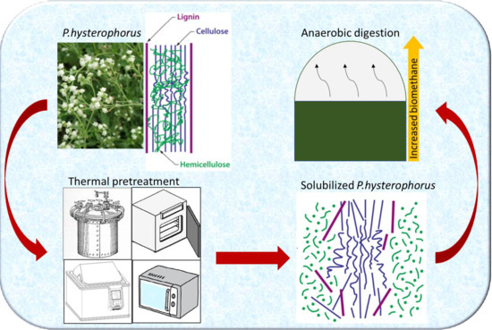 This study evaluated the influence of four thermal pretreatment techniques—autoclaving, hot-air oven treatment, hot-water immersion, and microwave irradiation—on Parthenium hysterophorus biomass to improve its biodegradability and biogas generation potential under batch anaerobic digestion. Among the investigated methods, hot-air oven pretreatment at 110 °C for 90 min exhibited the most significant enhancement in biomass solubilization, as indicated by a 51.5% rise in soluble chemical oxygen demand (sCOD) and an increase in volatile fatty acids (VFAs) compared with the untreated control. These compositional improvements facilitated faster hydrolysis and led to a 25.73% higher cumulative methane yield in biochemical methane potential (BMP) assays. Structural analysis revealed pronounced alterations in the lignocellulosic matrix, with reductions in hemicellulose and partial delignification improving substrate accessibility. Complementary characterisation using field emission scanning electron microscopy (FESEM), X-ray diffraction (XRD), and Fourier transform infrared spectroscopy (FTIR) confirmed the disruption of crystalline cellulose regions and modification of functional groups, supporting the observed biochemical improvements. Collectively, the results demonstrate that hot-air oven pretreatment is a practical and energy-efficient approach for enhancing the digestibility of P. hysterophorus biomass, promoting its utilisation as a sustainable feedstock for renewable biogas production and environmental management of this invasive weed.