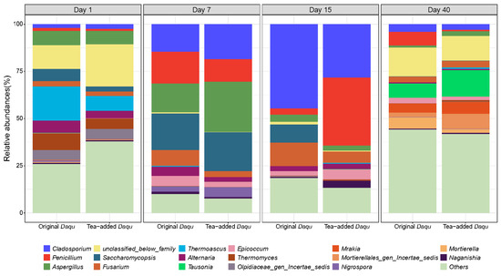 Incorporating plant-based additives was a promising approach for modulating the microbial ecosystems of fermentation starters. This study investigated how adding Kuding tea (20% wt/wt) influenced the assembly and succession of fungal communities during Jiang-flavored Daqu production, compared to traditional wheat-based Daqu. Using