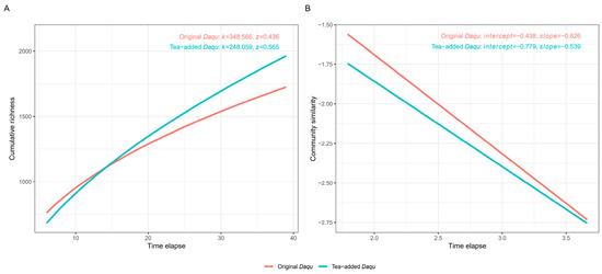 Incorporating plant-based additives was a promising approach for modulating the microbial ecosystems of fermentation starters. This study investigated how adding Kuding tea (20% wt/wt) influenced the assembly and succession of fungal communities during Jiang-flavored Daqu production, compared to traditional wheat-based Daqu. Using amplicon sequencing of the ITS1 region and integrated measurements of endogenous factors, we analyzed community dynamics across a 40-day fermentation period. Results showed that tea addition significantly increased fungal diversity and altered succession trajectories. Community assembly shifted from stochastic towards deterministic processes, with homogeneous selection increasing from 0.47 in wheat-based Daqu to 0.62 in tea-added Daqu. Temporal species accumulation was stronger (STR exponent z: 0.565 vs. 0.436), while compositional turnover slowed (TDR slope w: −0.539 vs. −0.626). Random forest models revealed tea-specific fungal drivers and stronger correlations with endogenous factors (e.g., reducing sugar and moisture). We concluded that Kuding tea appears to function predominantly as an environmental filter that enhanced deterministic selection, stabilized community succession, and restructured the key microbial–physicochemical relationships, providing a potential strategy for steering Daqu fermentation.