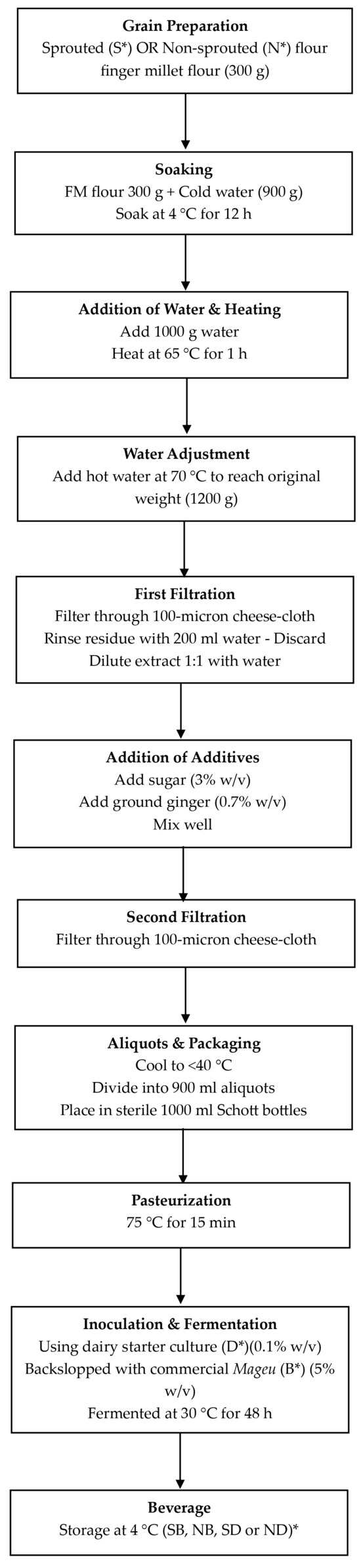 The rising demand for plant-based, lactose-free functional beverages amid gut health concerns positions finger millet (FM, Eleusine coracana) as a promising substrate. This study assessed sprouting and fermentation inoculum effect: dairy starters (Streptococcus thermophilus and Lactobacillus bulgaricus) or backslopping with commercial Mageu on microbial growth, fermentation dynamics, nutrition, antioxidants, color, and texture of FM beverages. Microbial growth increased modestly over 48 h OD600 = 0.169–0.201, peaking in non-sprouted FM with dairy starters (ND) at OD600 = 0.201). ND showed the fastest pH decline (ΔpH = 2.19), while sprouted FM with dairy starters (SD) or backslopping (SB) had controlled acidification. Total titratable acidity increased from 0.14 to 0.66%, with the highest total soluble solids in sprouted substrates (SD = 11.26 °Brix; SB = 10.97 °Brix). Proximate analysis revealed SB had high crude fiber (2.86%) and SD highest protein (4.02%). Sprouted beverages excelled in minerals (SB Ca = 27.00 mg/100 g; SD Ca = 25.75 mg/100 g), while ND or non-sprouted FM fermented spontaneously (NS) had high Fe (4.31%, 2.65%) and K (48.08%, 38.32%). ND showed peak antioxidants: phenolics 10.54 µg/mL, DPPH 87.80%, FRAP 21.24 µM Fe2+/g, ABTS 79.09%. Sprouted beverages displayed distinct color (L* = 37.67–39.65, C* = 25.94–27.03) versus commercial Mageu (L* = 57.89, C* = 14.50) and favorable texture (firmness 12.78–13.40 g, secondary peak force ~−7.2 g). Controlled fermentation of sprouted FM yields nutrient-dense, antioxidant-rich, vegetarian beverages with superior attributes, affirming its functional potential.