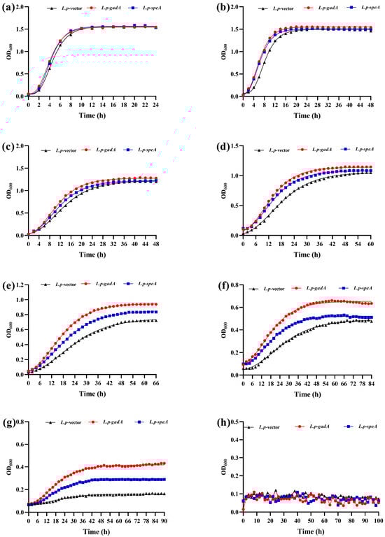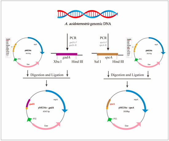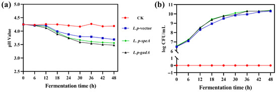 Enhancing the acid tolerance of Lactiplantibacillus plantarum is essential for improving its fermentation performance and metabolic activity under acidic conditions, thereby strengthening its probiotic functionality. In this study, the glutamate decarboxylase gene (gadA) and the arginine decarboxylase gene (speA)