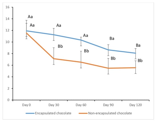 This study investigated the development of a sugar-free prebiotic and probiotic dark chocolate formulated with 39.76% cocoa mass, 41.856% cocoa butter, 14.8% inulin, and 1.6% stevioside. To enhance the stability of the probiotic yeast Saccharomyces boulardii, a microencapsulation technique using a cocoa powder, Na-alginate, and fructooligosaccharides (10:1:1 ratio) matrix was employed. The physicochemical properties and probiotic viability were monitored over a 120-day storage period at 25 °C. A significant increase in pH values was observed during storage (p < 0.05), while water activity (aw) values significantly decreased (p < 0.05). Encapsulation provided superior protection, with encapsulated samples retaining 2.51 log CFU/g more probiotics than unencapsulated samples after 120 days. Furthermore, in vitro gastrointestinal digestion assays conducted after one day of storage demonstrated the protective efficacy of the matrix; while unencapsulated probiotics suffered a drastic reduction of 6.42 log CFU/g under gastric conditions (pH 3, 2 h), the encapsulated probiotics showed a significantly lower reduction of only 3.99 log CFU/g. These results confirm that the Na-alginate/FOS-based encapsulation significantly improves the resilience of S. boulardii against both storage conditions and gastrointestinal stress, making this sugar-free prebiotic chocolate an effective delivery vehicle for probiotic yeasts.