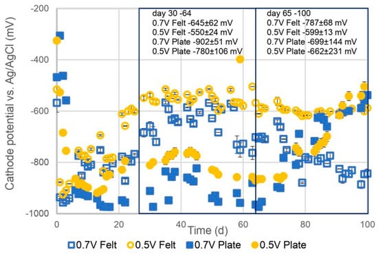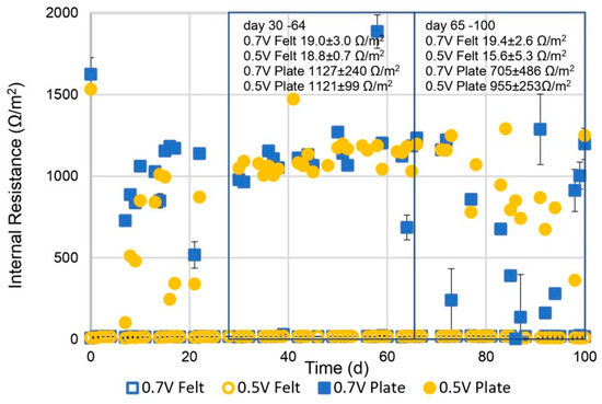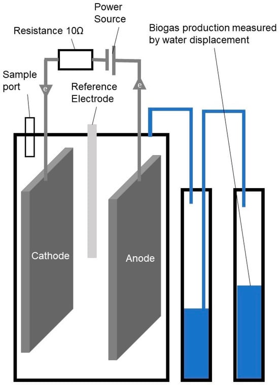 To address the limitations of conventional anaerobic digestion (AD), this study explored the integration of microbial electrolysis cells (MECs) with AD to improve biogas production and process stability. While AD is a proven technology for renewable energy recovery from waste, it can suffer from volatile fatty acid accumulation and reduced efficiency. The hybrid MEC–AD system leverages electro-methanogenesis to enhance methane yields and overall system performance. This research evaluated the effects of different electrode materials (graphite plate vs. graphite felt) and applied voltages (0.5 V and 0.7 V) on biogas output, methane content, and operational stability. Results showed that MEC–AD systems significantly outperformed conventional AD, with the highest biogas production reaching 239 ± 3 mL/gVS·d—an increase of up to 162% using graphite felt electrodes at 0.5 V. Internal resistance was also markedly lower with graphite felt (19 Ω/m2) compared to graphite plates (1120 Ω/m2). Furthermore, the pH of the MEC–AD system with graphite felt electrodes was maintained within the optimal range (6.8–7.0), avoiding the acidification seen in control systems. These findings underscore the promise of MEC–AD systems for advancing circular bio-economy initiatives and carbon neutrality. Further work is needed to refine electrode materials and reactor design for improved scalability and efficiency.