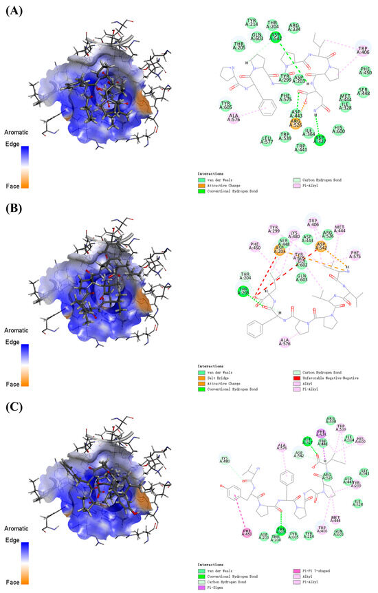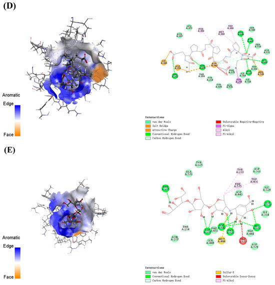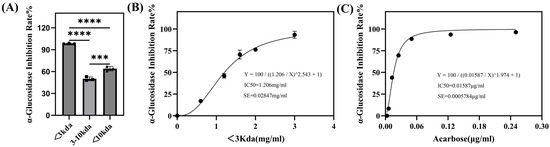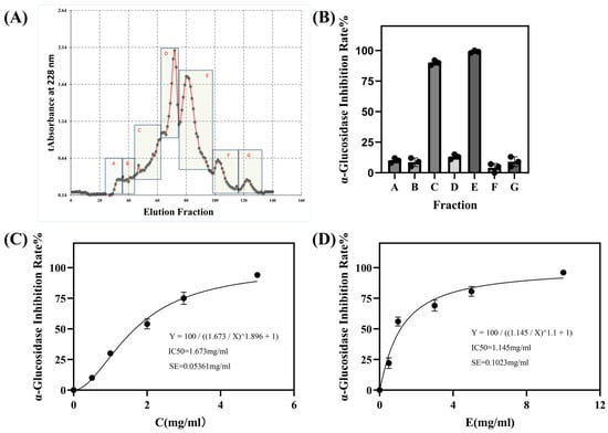 This study investigated the generation of α-glucosidase inhibitory peptides from whey protein fermented by the marine-derived probiotic Lacticaseibacillus casei DS31 (isolated from the intestinal microbiota of the large yellow croaker, Larimichthys crocea) and assessed their potential for practical glycemic management. Fermentation markedly increased inhibitory activity, with the freeze-dried crude supernatant exhibiting an IC50 of 2.115 mg/mL. Activity was further enriched through stepwise purification: ultrafiltration (<3 kDa) improved potency (IC50 = 1.206 mg/mL), and subsequent Sephadex (crosslinked dextran) G-15 gel filtration yielded a more active E fraction (IC50 = 1.145 mg/mL). LC–MS/MS characterized 19 peptides, and integrated in silico screening (PeptideRanker combined with molecular docking) highlighted GEPGPEGPAG as a leading candidate, showing a more favorable predicted binding energy (−82.50 kcal/mol) than the positive control acarbose (−69.31 kcal/mol). Docking analysis suggests that GEPGPEGPAG may inhibit α-glucosidase by forming a stable network of hydrogen bonds, salt bridges, and hydrophobic interactions within the catalytic pocket. Overall, DS31-fermented whey and its enriched fractions show promise as functional ingredients for postprandial glycemic control.