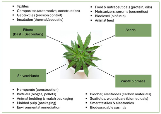 The generation of over 150 million tons of hemp waste annually is as much of a sustainability challenge as it is an opportunity for the circular bioeconomy. This review provides a critical analysis of the recent trends in the use of industrial hemp waste as a precursor to producing sustainable bioproducts. The objective is to synthesize the current state of knowledge and to identify the various pathways for valorizing hemp waste beyond the traditional applications. The methodology involved the systematic assessment of the recent literature to identify the applications in textiles, biocomposites, packaging, and, most importantly, advanced areas such as hemp-based carbon materials for storing energy, biomedical materials, and smart biomaterials. Findings showed that hemp waste is a versatile material for creating high-value products, as it shows promise in carbon electrodes for supercapacitors as well as reinforcement for 3D-printed biocomposites. However, there are some limitations in terms of standardization and scalability. The review concludes that future progress depends on multidisciplinary research to optimize conversion and utilization processes, including the development of comprehensive life-cycle assessments and reliable supply chains.