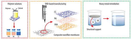 This study presents the fabrication and performance analysis of multilayer membranes produced by electrospinning using polyacrylonitrile (PAN), chitosan (CS), and Nylon 6 (N6) for the removal of chromium (Cr) and cadmium (Cd) from water. The electrospun membranes were configured in six different multilayer