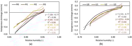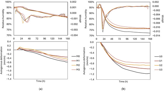 The incorporation of recycled tyre polymer fibres (RTPF) in cementitious composites provides an effective and sustainable approach in tyre waste management while offering potential benefits in mitigating early-age volume deformations. This study evaluates the influence of RTPFs, used in dry (RTPFd) and pre-wetted (RTPFw) states, on key hydration processes governing autogenous shrinkage in cement pastes with w/c of 0.4 and 0.22. The results show that RTPF reduced workability and altered the setting process due to the fibre–matrix mechanical interactions. Incorporation of RTPFs induced changes in water distribution at the fibre surface, delaying self-desiccation and maintaining higher internal relative humidity. While RTPFs offer a beneficial reduction in autogenous shrinkage by 12–41% in mixtures with w/c of 0.4 and by 15–34% in mixtures with w/c of 0.22, RTPFs also increased porosity, which contributed to a reduction in 28-day compressive strength of up to 16%. These findings highlight the dual effect of RTPF on early-age performance and provide insight into their potential application in sustainable cementitious composites.