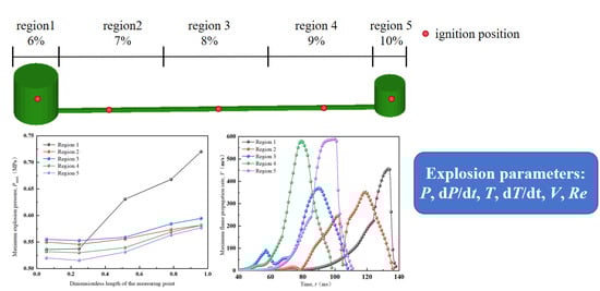 This study examines the influence of ignition position on explosion characteristics in linked vessels with a methane concentration gradient, aiming to support the safety of industrial combustible gas storage systems. A numerical simulation method was adopted, using a vessel-pipe-vessel linked device. Explosion parameters