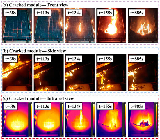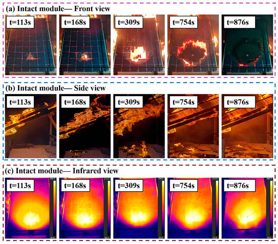 In order to achieve the goal of carbon neutrality, the installed capacity of photovoltaic (PV) modules has been increasing rapidly. In particular, single-glass PV modules are widely deployed in both utility-scale and distributed PV power generation systems. However, single-glass modules are highly susceptible to internal faults (e.g., direct current arc faults and hotspot faults) and external fire sources (e.g., wildland fires and rooftop fires), which may lead to simultaneous burning of the modules and adjacent combustibles, thereby promoting large-scale fire spread and causing severe economic losses. In this study, a dedicated experimental platform was developed to systematically investigate the fire behavior of single-glass PV modules under exposure to a pool fire. Systematic fire experiments were conducted to investigate the influence of module inclination angle and tempered glass integrity on the burning process, molten dripping flame behavior, and temperature-rise characteristics of single-glass PV modules. The results show that the integrity of the front glass has a pronounced effect on the burning behavior. At the same inclination angle, cracked modules exhibit significantly faster fire growth and higher temperature-rise rates than intact modules, while also being more susceptible to rapid burn-through by the external fire, accompanied by the generation of numerous molten dripping flames. In addition, the module inclination angle has a significant influence on the fire behavior of PV modules. As the inclination angle increases, the fire development rate, temperature-rise rate, and average burning duration of dripping flames all display a non-monotonic trend of first increasing and then decreasing, reaching their maxima at an inclination angle of 15°. These findings provide a theoretical basis for the fire protection design and fire risk assessment of PV power generation systems and are of practical significance for enhancing their operational safety.