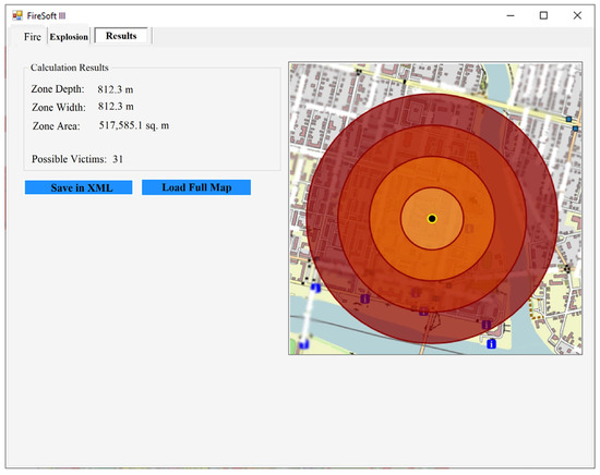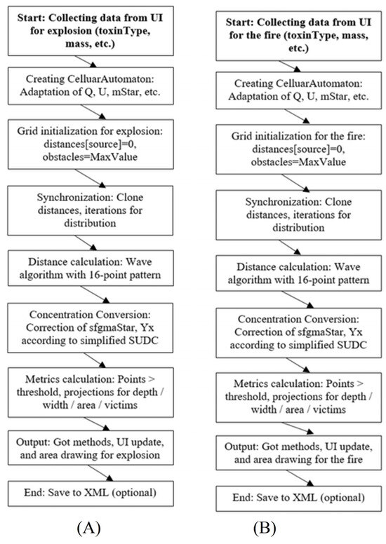 Modeling and visualizing zones within the spread of toxic clouds from fires and explosions during accidents at industrial facilities located near residential areas is of high practical value. This tool is critical for the rapid planning of population evacuation measures and emergency response. Of particular importance is the development of computer software that can quickly model the hazard zone of toxic cloud spread and superimpose it on a terrain map to determine the potential impact on residential areas. This software should be based on a mathematical model that can accurately predict the parameters of the hazard zone both near the industrial facility and beyond it, at a distance of more than 1 km. The objective of this study is to create algorithms for modeling the hazard zone during a fire or explosion at an industrial facility using a cellular automaton method and to develop a software tool for its visualization. The software must display the hazard zone for the population of a nearby residential area on a map in real time, which is necessary for assessing potential harm to residents’ health and in planning their rapid evacuation. To achieve this objective, this article presents a model for determining the boundaries and main parameters of a hazard zone based on the cellular automaton method (frontal and probabilistic). The proposed model takes into account both constants (properties of chemical substances, building parameters, population size, etc.) and variables (the mass of the substance at each explosion and fire, wind speed and direction, air temperature, etc.). The FireSoft III software, developed by the authors and based on the cellular automaton model, provides more rapid calculation of the parameters and delineation of the hazard zone boundaries compared to similar software, which was tested in cases of an ammonia tank explosion and a prolonged fire in a warehouse containing polyvinyl chloride at an enterprise. This makes FireSoft III promising for use in a fire and explosion response at enterprises.