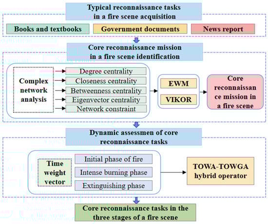 At present, large-scale hazardous chemical logistics warehouses are characterized by complex structural layouts, diverse stored materials, and high operational risks, which pose significant challenges to fire emergency response. The awareness of hazardous material inventory, orderliness, and timeliness of on-site reconnaissance directly determine the efficiency and safety of firefighting and rescue operations. In response to these challenges, this study, based on 77 fire cases involving hazardous chemical logistics warehouses, proposes an evaluation framework that integrates a TOWA–TOWGA hybrid operator with complex network analysis. Accordingly, a fire scene core reconnaissance task identification model is developed. The new model is capable of identifying key reconnaissance tasks while capturing the dynamic evolutionary patterns of fire development across three distinct stages. The research findings demonstrate that identifying the fire’s spread direction, locating accessible water sources, and pinpointing the fire’s ignition point constitute the core tasks throughout the entire fire emergency response cycle. The priority ranking of these core tasks exhibits distinct temporal variability as the fire evolves dynamically. This model enables the accurate identification of key reconnaissance tasks and critical operational pathways, thereby providing robust theoretical support and a solid practical foundation for fire rescue teams to optimize resource allocation strategies and formulate science-based reconnaissance protocols.