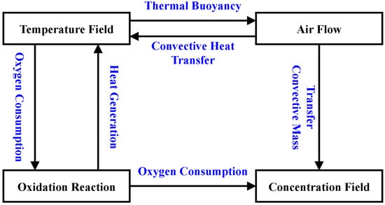 Spontaneous combustion of coal piles threatens the production and transportation safety of coal mining, which is attracting more and more attention. To understand the underlying physics, conducting pore-scale research on the spontaneous combustion of coal piles is critical. To enable pore-scale research, a pore-scale model of the spontaneous combustion of a coal pile is described, and governing equations are introduced. To understand the competition between airflow, heat–mass transfer, and oxidation reaction, the lattice Boltzmann method (LBM) is utilized, which offers distinct advantages in handling complex pore geometries, multi-physics coupling, and reactive transport at the pore scale. The present model integrates, for the first time in a pore-scale LB framework, airflow driven by thermal buoyancy, convective heat and mass transfer, and Arrhenius-type oxidation kinetics within a realistic coal pile geometry. After the numerical method is validated, the effects of inflowing air velocity, inflowing air temperature, oxygen concentration, and coal particle size are discussed. With an increase in inflowing air velocity, convective heat transfer is enhanced, and the coal pile maximum temperature decreases monotonically. According to the Arrhenius equation, with an increase in the inflowing air temperature and oxygen concentration, the oxidation reaction is accelerated, and the coal pile maximum temperature increases. When the size of the coal particle increases, the oxidation reactive area decreases, and the coal pile maximum temperature decreases, while the steady temperature is not affected.