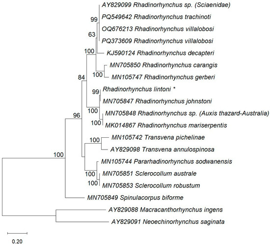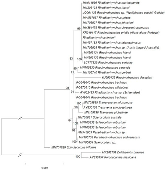 Rhadinorhynchus is a parasitic genus within the order Echinorhynchida (family Rhadinorhynchidae), comprising over 50 species found in marine ecosystems. The life cycle of Rhadinorhynchus species generally includes marine fish as definitive hosts and zooplankton as intermediate hosts. During a routine marine parasitological survey