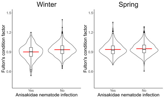Over the past few decades, the population of cod in the Eastern Baltic has faced numerous challenges due to environmental changes, overfishing, and predation, as well as the effects of infection by third-stage larvae of the Anisakidae parasite in the liver. The aim of this study was to estimate the prevalence and infection level of Anisakidae nematodes in the Eastern Baltic cod stock over a five-year period and analyze the effect of infection on cod health condition. A total of 1946 samples of the Eastern Baltic cod (Gadus morhua) were collected and tested for the presence of Anisakidae nematode larvae. All nematodes found in livers were identified as Anisakidae with an overall prevalence of 30.9%, a mean infection density of 0.8 (median 0.4) nematodes per gram of liver tissue, and a range of 0.01–29.2 nematodes per gram. The prevalence of infection tended to increase with the age of the fish. In multivariate analysis, increasing infection intensity decreased the odds of cod having good Fulton’s and Clark’s condition scores and a hepatosomatic index (HSI) above the population average. While our study shows a clear Anisakidae effect on Fulton’s and Clark’s condition scores and the HSI, these indicators could also be influenced by other environmental, physiological, and pathological factors.