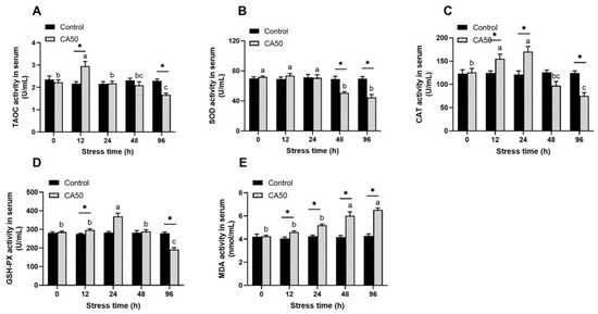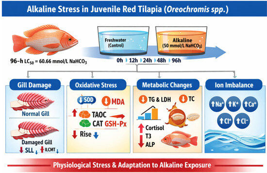 With increasing global demand for fishery products, saline-alkaline aquaculture has emerged as a potential solution. However, limited information exists regarding the tolerance and adaptability of red tilapia (Oreochromis spp.) to alkaline environments. This study evaluated the acute semi-lethal toxicity of alkaline water and its physiological effects on juvenile red tilapia (44.80 ± 1.09 g; 12.84 ± 1.02 cm). Fish were exposed to NaHCO3 for 96 h at five alkalinity levels (50, 55, 60, 65, and 70 mmol/L). Survival declined significantly with increasing alkalinity, and the 96 h LC50 was 60.66 mmol/L, indicating relatively high alkaline tolerance. Gill tissue and serum samples were collected at 0, 12, 24, 48, and 96 h under 50 mmol/L NaHCO3 and freshwater (control). Under prolonged alkaline exposure, gill structure exhibited marked alterations, with SLL and ILCMT progressively decreasing over time. Serum antioxidant responses were impaired, showing a sustained decline in SOD activity and a rise in MDA content, indicating the onset of oxidative stress. TAOC, CAT, and GSH-Px displayed a biphasic response, rising initially before declining with continued stress. TP and GLU levels remained largely stable throughout. Energy metabolism indices also shifted dynamically: TC showed a transient increase followed by a decrease, whereas TG and LDH initially declined before rising later in the exposure period. Stress-related markers, including cortisol, T3, ALP, and ACP, were notably elevated during the exposure. Additionally, serum ion concentrations (K+, Ca2+, Na+, Cl−) increased gradually over the 96 h period, reflecting progressive osmoregulatory disturbance under alkaline stress. Overall, this study shows that juvenile red tilapia (Oreochromis spp.) have high alkaline tolerance (96 h LC50 = 60.66 mmol/L NaHCO3), but exposure to alkaline water causes significant physiological stress, affecting gill structure, antioxidant defense, metabolism, and ion balance. These results offer valuable insights into their adaptability to saline-alkaline aquaculture.