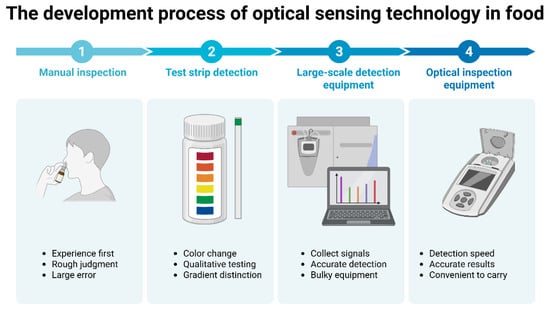 Food safety has recently attracted increasing attention, underscoring the need for timely and accurate on-site testing technologies. Optical detection, among various methods, offers notable advantages, including ease of use and rapid results, making it a promising approach for food safety applications. This paper reviews the fundamental principles of optical inspection for food field examination and explores its practical applications, including techniques such as surface-enhanced Raman scattering, UV–visible absorption spectroscopy, and fluorescence detection. Furthermore, this review discusses the integration of detection technologies with nanotechnology and smartphone-based systems. In addition, this review discusses the current applications, challenges, and potential solutions associated with optical detection in on-site food inspections.