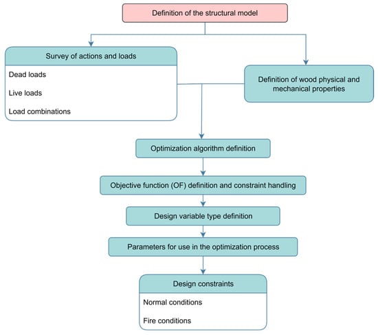 This article examines how the time of exposure (0, 10, 20 and 30 min) to fire affects the optimal design of Howe timber trusses. The study integrates experimental characterization, thermal modeling (Eurocode 5 1995-1-2), and the bio-inspired Firefly Algorithm (FA). Five Brazilian species