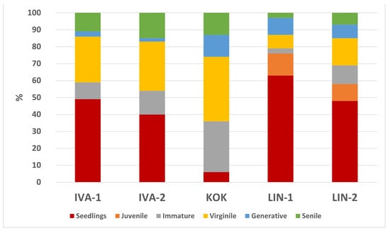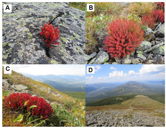 Background: Rhodiola quadrifida (Pall.) Fisch. & C.A. Mey. (Crassulaceae) is a rare medicinal species in the Kazakh Altai, yet information on its population structure and genetic diversity remains limited. This study presents findings from an investigation of natural R. quadrifida populations. Methods: The morphometric characteristics, population age structure, and genetic diversity of the plants were analysed using PCR-based genome profiling. Genetic diversity within R. quadrifida populations was assessed using PCR primers for binding sites complementary to a specific region at the 3′ terminus of a particular tRNA. Results: The populations exhibited variations in morphological traits, age structures, and reproductive strategies. The IVA-1, IVA-2 and KOK populations represent the most mature stages, characterized by a dominance of vegetative reproduction and a disturbed age structure, with a predominance of senile and virgin individuals. In contrast, the LIN-1 and LIN-2 population is characterized by a balanced age structure, encompassing all ontogenetic groups, and a mixed reproductive system that includes both sexual and vegetative propagation. Genetic diversity, as measured by Shannon’s information index, ranged from 0.194 to 0.247, indicating low genetic diversity in R. quadrifida. Analysis of molecular variance (AMOVA) revealed significantly greater variation within populations (62%) than among populations (38%). Genetic diversity was higher in the LIN-1 and LIN-2 populations, which employs a mixed reproductive system (clonal and seeds), than in populations dominated by vegetative reproduction. Both LIN populations, characterized by a mixed reproductive system, exhibited higher genetic diversity than the KOK, IVA-1 and IVA-2 populations, where vegetative reproduction predominated. Conclusions: These results underscore the necessity for priority conservation measures, including monitoring population size and age structure in populations with low levels of seed reproduction and disturbed age structure. Additional measures include supporting in situ and ex situ conservation, such as clonal collection, seed banks, and tissue cultures, as well as restricting the harvesting of medicinal raw materials.