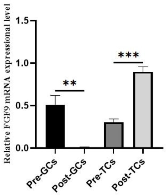 Objectives: Fibroblast growth factor 9 (FGF9), a crucial member of the FGF family, functions as an intercellular signaling molecule involved in angiogenesis, embryogenesis, and tissue repair. Our previous study demonstrated that FGF9 expression in chicken hierarchical granulosa cells (Post-GCs) is regulated by LSD1