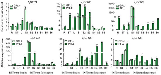 Background: Dihydroflavonol 4-reductase (DFR) is pivotal for anthocyanin biosynthesis and plays a crucial role in plant development and stress adaptation. However, a systematic characterization of the DFR gene family is lacking in Lonicera japonica Thunb. Methods: In the present study, based on genome and transcriptome data of L. japonica, the research identified six LjDFR gene family members throughout the entire genome. Results: The LjDFR genes were located on Chr.04 and Chr.09 and the full-length coding sequences of LjDFR1-LjDFR6 were cloned. Subcellular localization analysis showed that LjDFRs are primarily found at the cell membrane and in the nucleus. Phylogenetic analysis showed closer clustering of LjDFR genes with Capsicum annuum and Camellia sinensis. Promoter analysis linked LjDFR genes to light response, hormone signaling, and stress-responses. qRT-PCR analysis demonstrated tissue-specific and stage-specific expression patterns among LjDFR members. Notably, LjDFR2 expression was significantly higher in the intensely pigmented tissues of Lonicera japonica Thunb. var. chinensis (Wats.) Bak. compared to L. japonica. Coupled with its phylogenetic proximity to the anthocyanin-related CsDFRa and CaDFR5 genes, this suggests that LjDFR2 may be positively correlated with anthocyanin accumulation. Additionally, the expression of LjDFR2 and LjDFR4 was markedly induced by both drought and salt stress, indicating their roles in abiotic stress responses. Conclusions: This research provides a foundation for further functional studies of LjDFR genes in anthocyanin biosynthesis and stress resistance and offers candidate genes for molecular breeding of L. japonica.