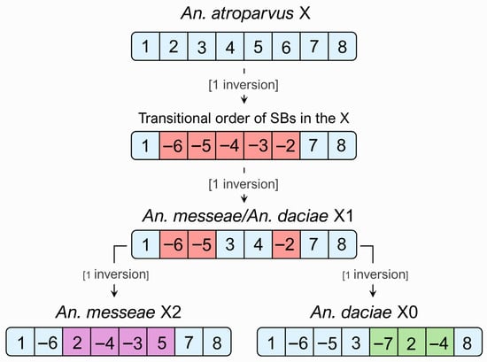 Background/Objectives: Chromosomal inversions play an important role in the evolution of insects by forming genetic barriers between closely related species and facilitating local adaptation. Polymorphic inversions in malaria mosquitoes of the Maculipennis subgroup have been studied for over 50 years, yet the evolutionary ancestry of the gene orders remains unknown. In this study, we mapped the genes flanking the breakpoints of two polymorphic X-chromosome inversions in the cryptic species Anopheles messeae and Anopheles daciae of the Maculipennis subgroup. Methods: We used an iterative mapping approach to define the breakpoint regions, selecting flanking markers based on the genome assembly of the reference species, Anopheles atroparvus. To identify the ancestral X chromosomal arrangement in An. messeae and An. daciae, we developed and implemented the genomic inversion calculator (GIC), which uses greedy heuristics to determine the shortest evolutionary scenario of rearrangements. Results: Our knowledge of the relative genomic positions of the inversion breakpoints in An. daciae and An. messeae enabled us to use the An. atroparvus genome as an outgroup and the GIC tool to show that the X0 and X2 arrangements emerged independently along the evolutionary lineages of An. daciae and An. messeae, respectively, based on the X1 arrangement. Conclusions: These results refine the structure and boundaries of the X chromosome rearrangements and reconstruct the sequence of evolutionary events in the cryptic complex An. messeae–An. daciae, demonstrating that the X1 arrangement is ancestral. This study lays the groundwork for analyzing the molecular organization of breakpoints, the mechanisms of inversion formation, and their role in speciation.