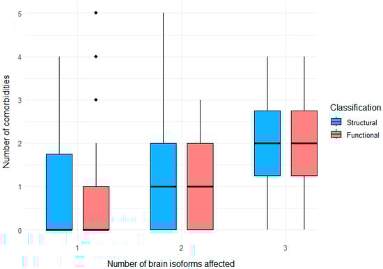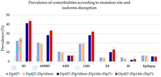 Background: Duchenne/Becker muscular dystrophy (DMD/BMD) is associated with a wide spectrum of brain-related comorbidities. Methods: This retrospective study assesses the neuropsychiatric profile of DMD/BMD patients and the hypothesis of a functional-versus-structural approach of dystrophin gene variants/impaired isoforms in relation to brain comorbidities. Patients with documented mutation in the DMD gene and neuropsychiatric assessments were included. Seven comorbidities were analyzed based on variant location and dystrophin brain isoform disruption. The clustering of comorbidities and genotype–phenotype correlations were studied. Results: 264 DMD/BMD patients met inclusion criteria. 22 variants have never been described before. A high prevalence of neuropsychiatric comorbidities was identified in the cohort with higher values in patients with distal mutations. The number of comorbidities increased with the number of brain dystrophin isoforms predicted to be lost. Functional-versus-structural comparison revealed that Dp140 5′UTR variants might not affect protein expression. Epilepsy and intellectual disability (ID) showed significant association in this cohort. Neuropsychiatric phenotype varied greatly in patients with identical variants, even between siblings. Conclusions: This is one of the largest European cohorts for which all these comorbidities were studied in association with DMD gene mutation site and the first study of this kind performed on the Eastern European DMD/BMD population. Our group analyzed, for the first time, Dp140 5′UTR variants in relation to all neuropsychiatric phenotypes and showed that epilepsy and ID are strongly associated in DMD/DMB patients.
