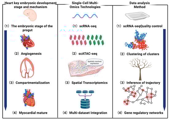 Background/Objectives: Cardiac embryonic development is a highly coordinated and dynamic process governed by precise spatiotemporal gene regulation. Increasing evidence indicates that cellular heterogeneity and lineage specification during heart development are tightly controlled by complex gene regulatory networks (GRNs) and epigenetic mechanisms. Recent advances